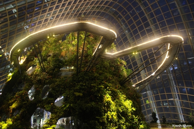 Chỉ cần bước qua cánh cửa kính mở tự động vào khu Cloud Forest, khách du lịch đến Singapore sẽ ấn tượng vì thác nước cao 35m đổ xuống ào ạt, bên trên điểm xuyết bởi những nhành lan trắng và tím với nền cây lá xanh thẫm. Khu rừng ẩm ướt, tái hiện thiên nhiên miền núi với độ cao từ 1.000 đến 3.000m so với mực nước biển, tương tự Kinabalu của Malaysia.