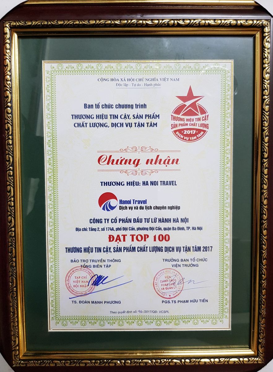 Năm 2017 CÔNG TY CỔ PHẦN ĐẦU TƯ LỮ HÀNH HÀ NỘI ( Hanoi Travel) vinh dự nhận giải thưởng "Thương hiệu tin cậy, sản phẩm chất lượng, dịch vụ tận tâm & gương mặt doanh nhân xuất sắc 2017" do Đài truyền hình Hà Nội tổ chức